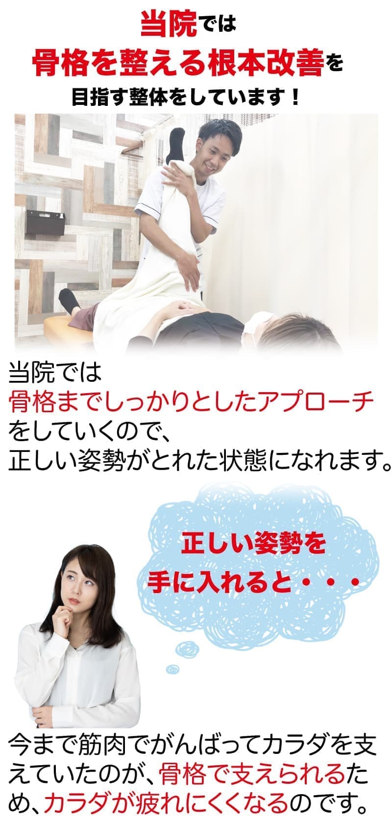 ゆがんでしまった骨格に対する施術や痛みの原因となる治療を受けていないからです。