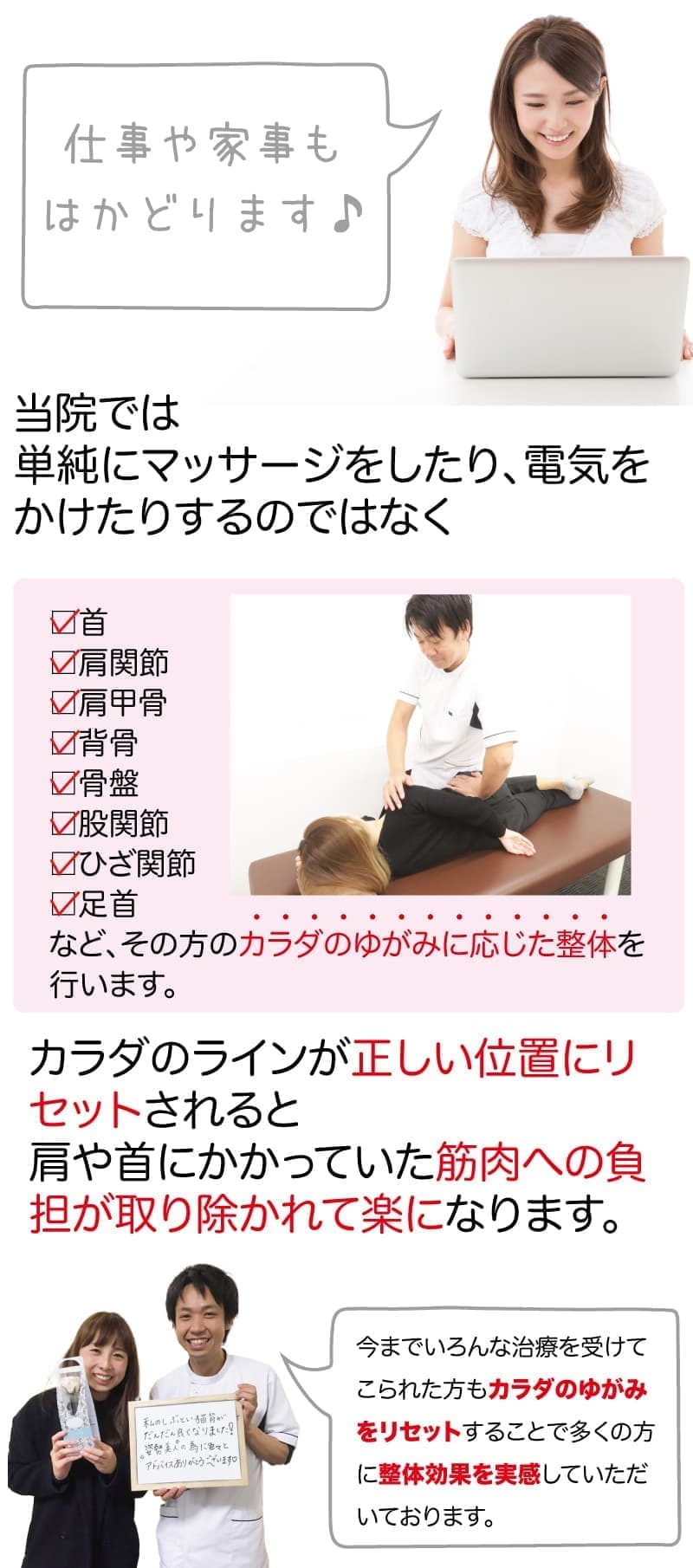 女性・男性問わず、多くの方がご来院されている整体院です。